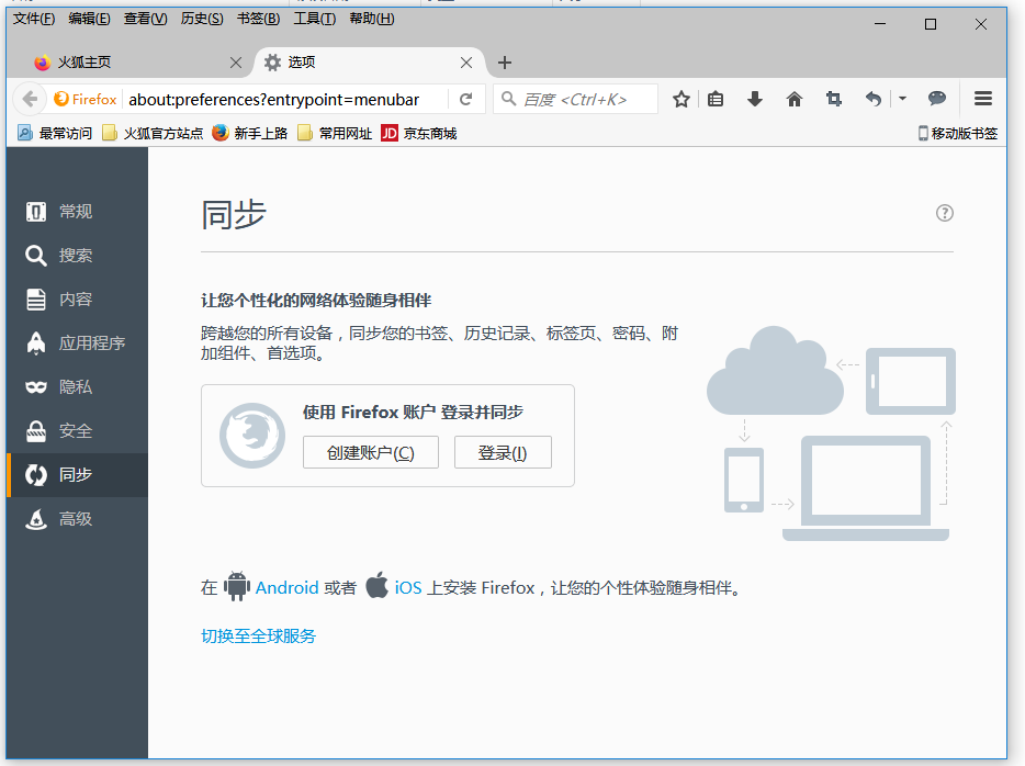2. 登陆方式不一致,火狐浏览器提供了本地服务和全球服务两种登陆方式,全球服务与本地服务是无法实现同步的。