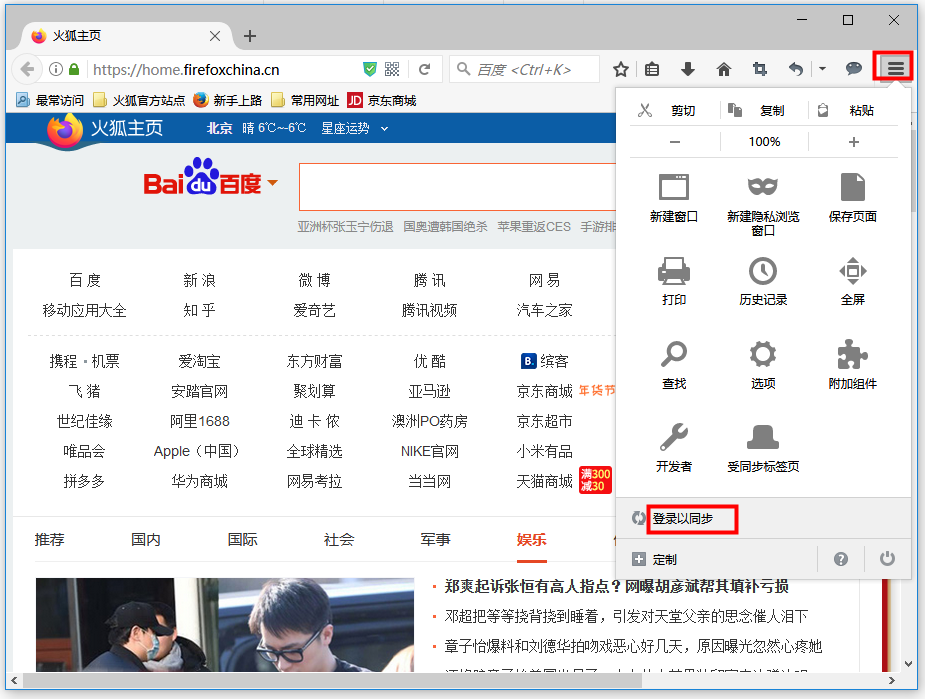 方法 1. 运行火狐浏览器,进入主界面,点击右上角的"打开菜单"选项,弹出列表,选择"登录以同步",