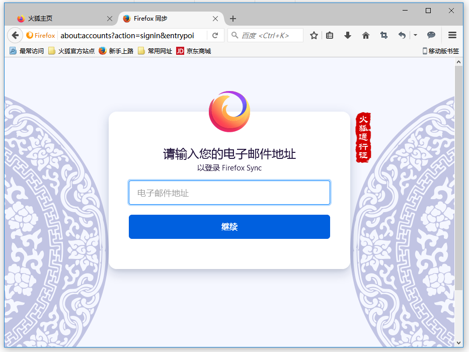 小编直接点击"登录",进入 Firefox 同步窗口,输入邮件地址,点击"继续",根据提示操作,
