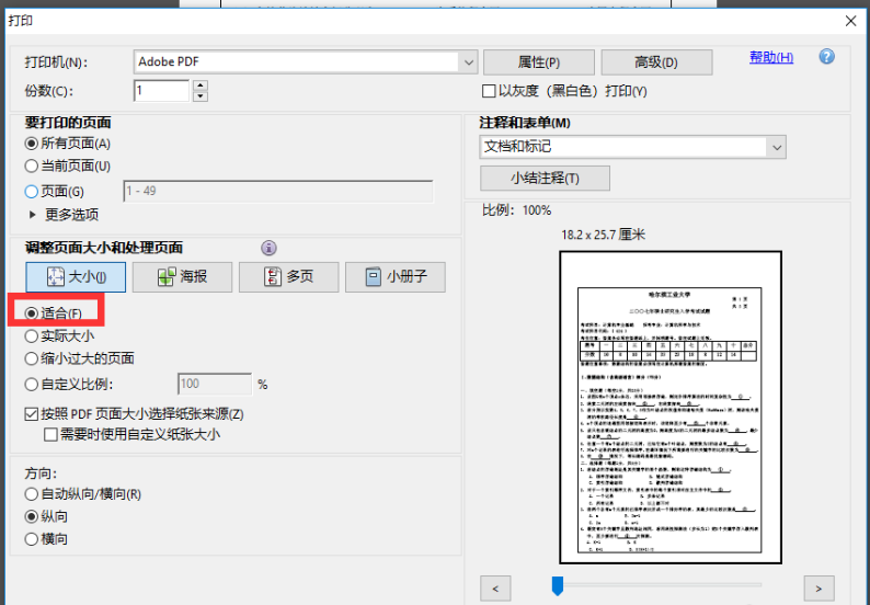 弹出打印窗口,勾选"适合"选项,点击打印,