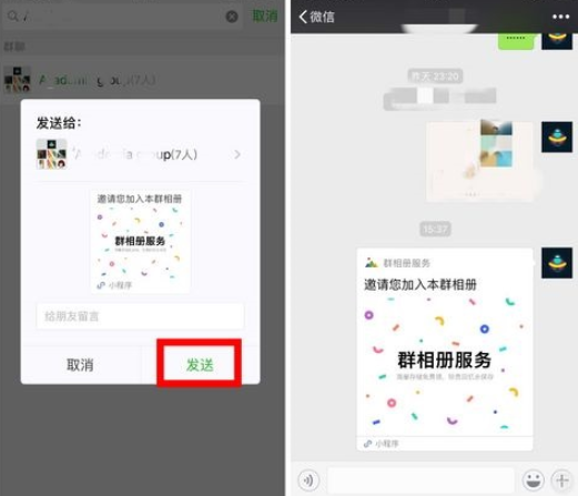 点击"创建群相册",弹出转发页面,选择你想要备份照片的微信群,点击发送,邀请好友加入群相册,