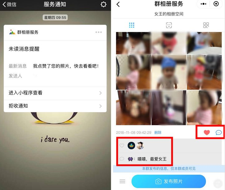 另外,如果群相册中上传了新的照片,群相册好友都能实时得到通知。随意打开一个自己加入的群相册,你还可以点赞、评论好友发布的照片,这完全就是一个群内的朋友圈!