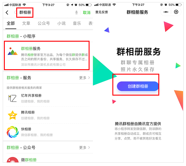 打开微信,点击搜索"群相册服务"小程序,点击进入,