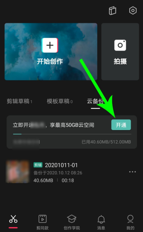 在手机中打开剪映 APP ,进入首页,点击"云备份",然后点击"开通",