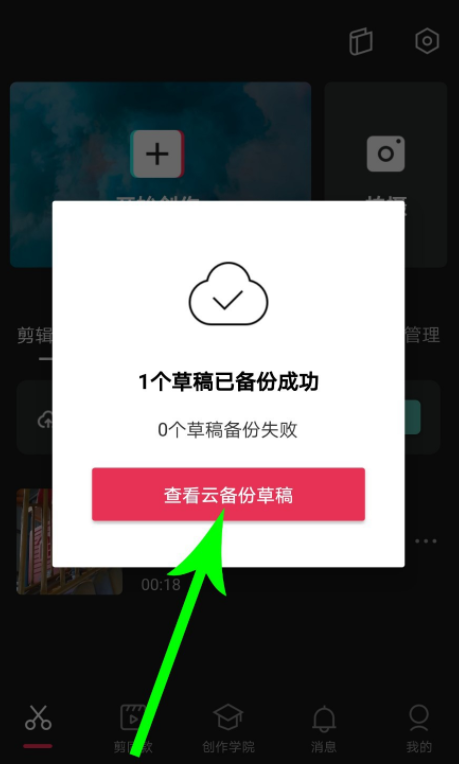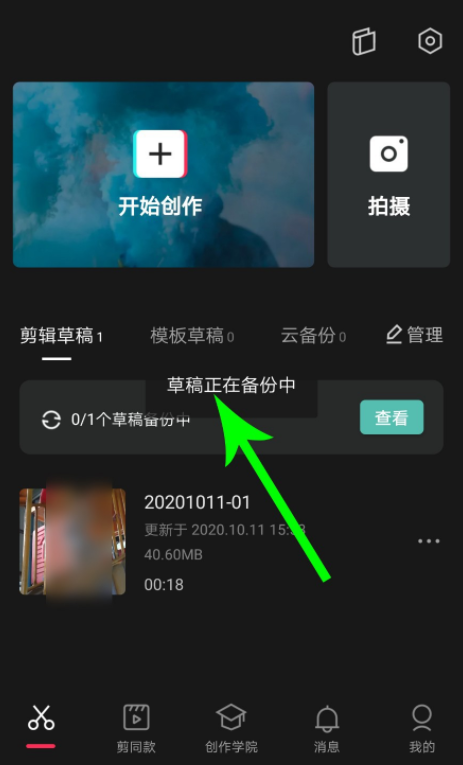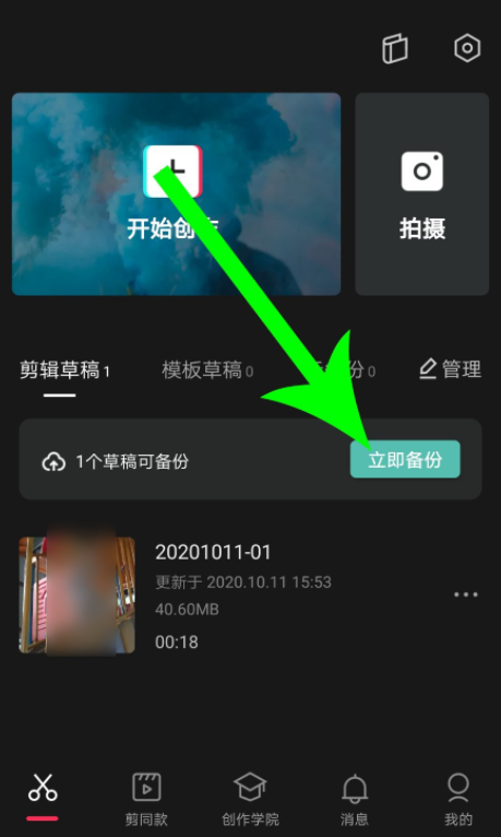 重新打开剪映 APP ,系统默认打开的是剪辑草稿分类界面,点击"立即备份",