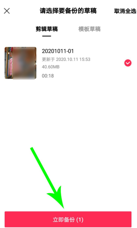进入以下界面,勾选需要备份的草稿视频,勾选完毕,点击"立即备份",