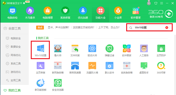 在 Win 10 系统上打开 360 安全卫士,点击功能大全,如下图所示: