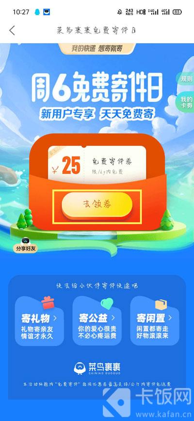 3. 随后在周 6 免费寄件日活动,点击"去领券"按钮;