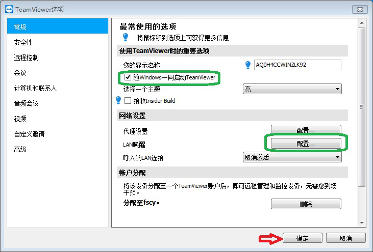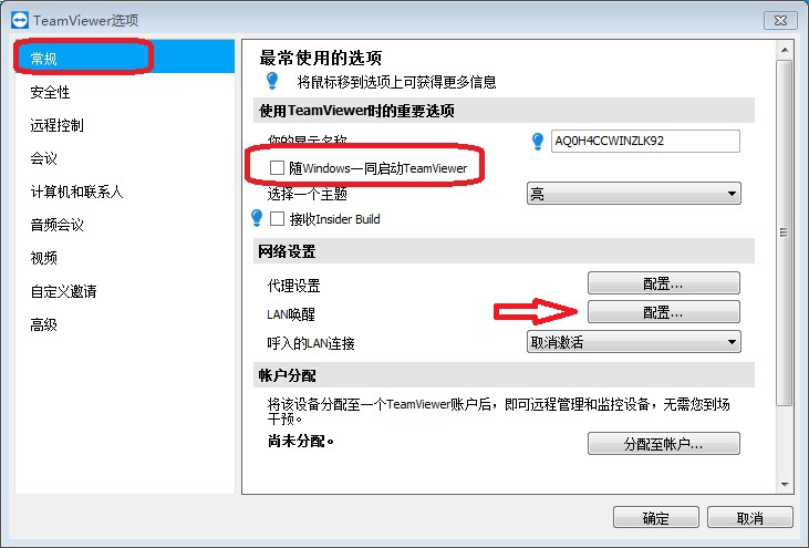 3. 点击左侧"常规",勾选“随 WINDOWS一同...”,然后点击 LAN 唤醒后的"配置"。
