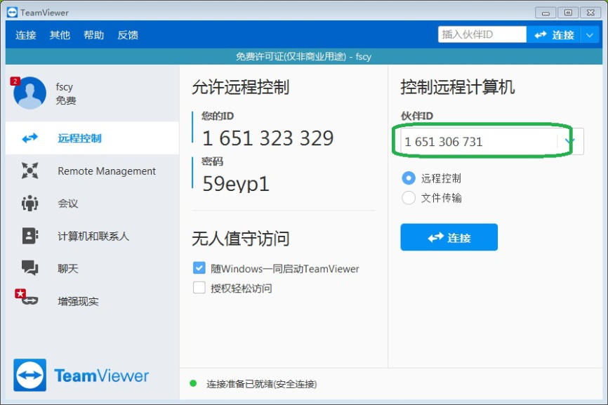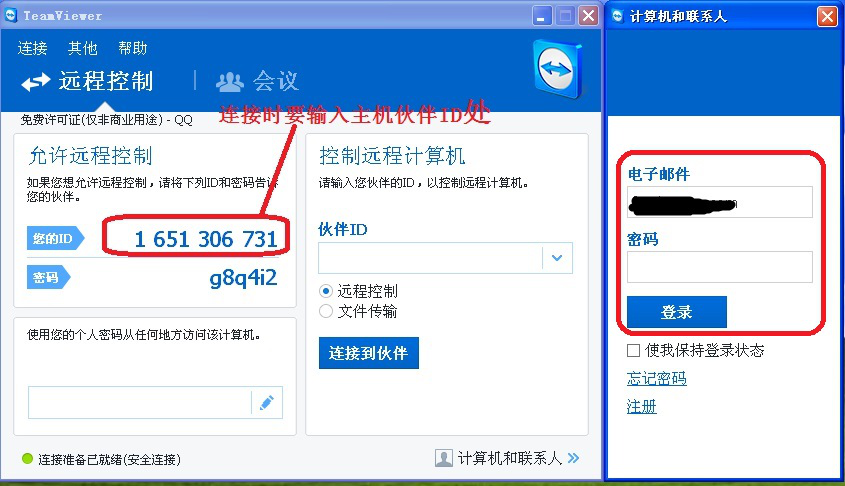 1. 打开客机上 TeamViewer 软件并登录制。(复制客机 ID 备用)