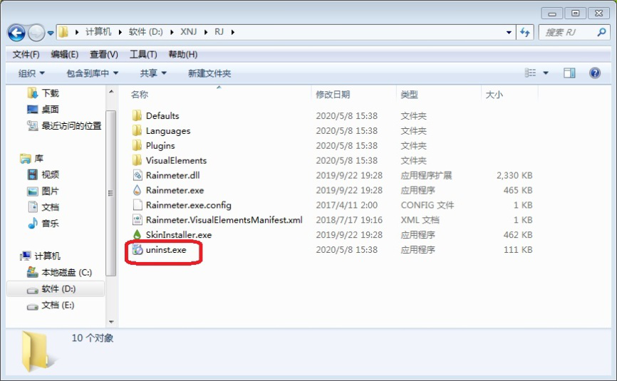 1. 找到RainMeter软件安装位置,在其中找到并点击"uninst.exe"。