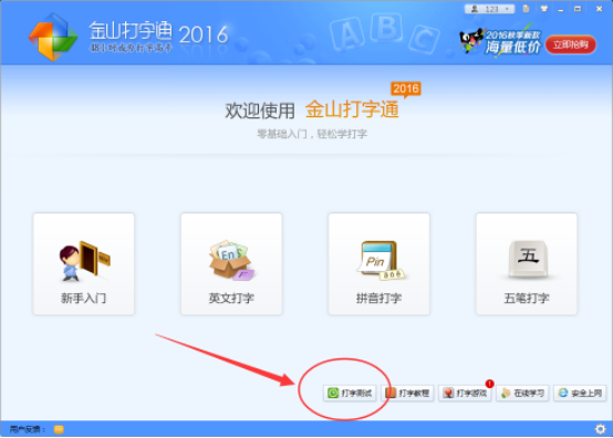 2. 登录完毕后在其界面底部找到"打字测试",在"打字测试"中就可以测试我们的打字速度了;