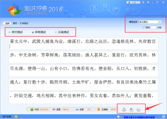 3. 我们可以测试英语. 拼音以及五笔,还可以自己选择课程,在底部还可以看到打字速度以及准确度等。