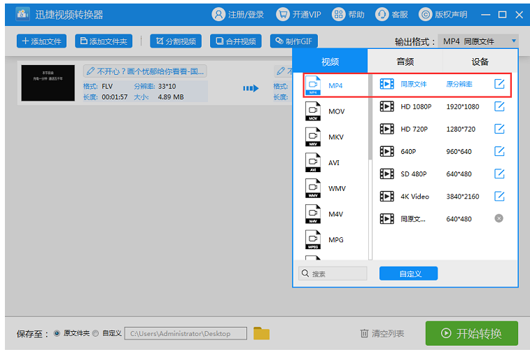 文件转码成功,点击"格式"或者"输出格式",选择目标视频格式,小编选的是 MP4 ,然后设置"同原文件/原分辨率",