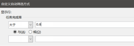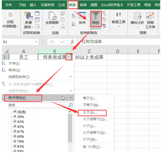 2. 选中需要筛选的源数据,即任务完成率一列的所有数据,然后依次点击上方菜单中的"数据"-"筛选",接着点击“任务完成率”右侧倒三角(即筛选标记),在其下拉菜单中点击"数据筛选"—"大于",如图。