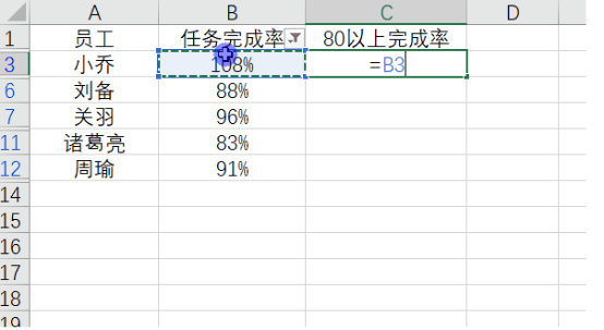 1. 下面我们以一个简单表格为例来说一下筛选状态下复制粘贴数据失去对应关系的情形。下图为一张员工完成率表格,需要将完成率在 80 % 以上的数据单独在右侧列出来。假设数据较多,那么就需要用到筛选。