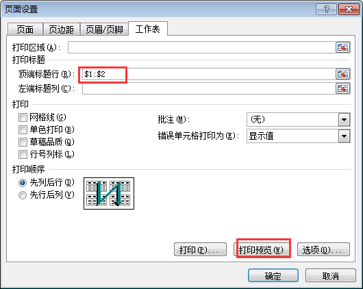 4. 这时就回到了页面设置窗口,可以看到标头标题所在行被选中,点击"打印预览"。