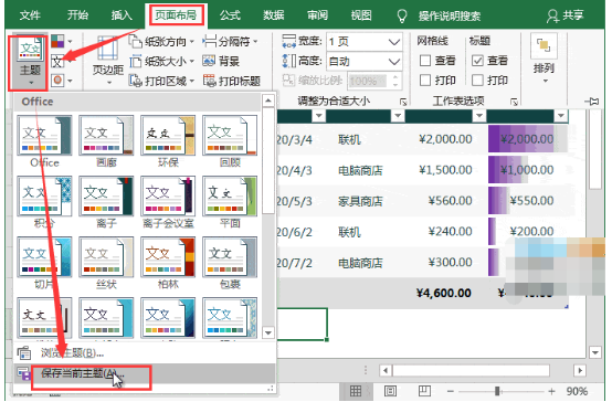 2. 在原表格中点击菜单栏中的“页面布局“,然后点击“主题“,在其下拉菜单中点击“保存当前主题“。