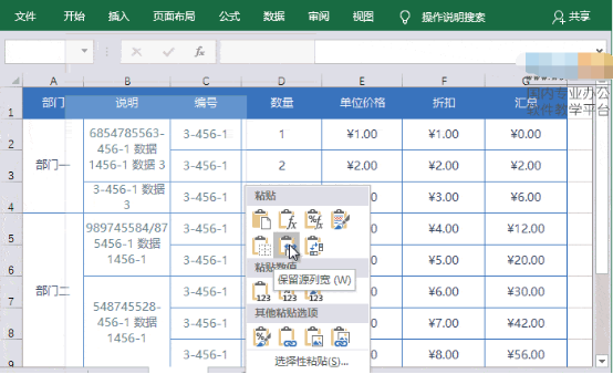 2. 选中目标单元格并右击,在其下拉菜单中点击“选择性粘贴“—“保留源列宽“。