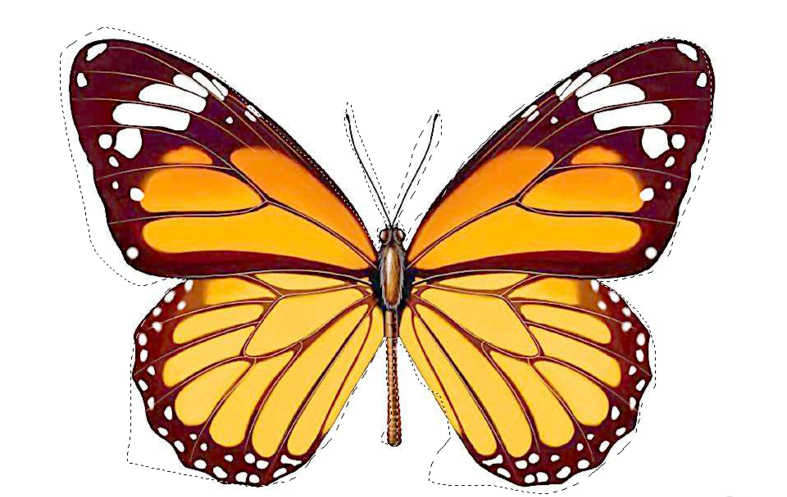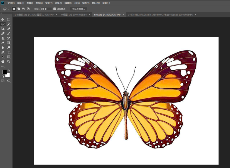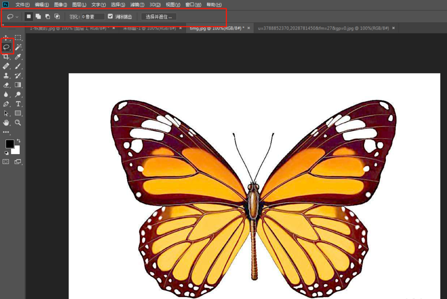 选择磁性套索工具,沿着蝴蝶的外部轮廓开始描,按住鼠标左键(不能松手)沿着主体边缘拖动,就会生成没有锚点(又称紧固点)的线条,