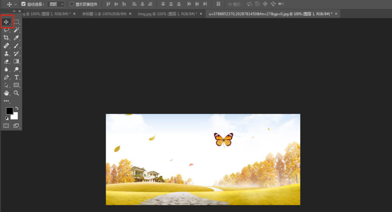 选择移动工具,按住鼠标左键拖动图片到另一张图片上,