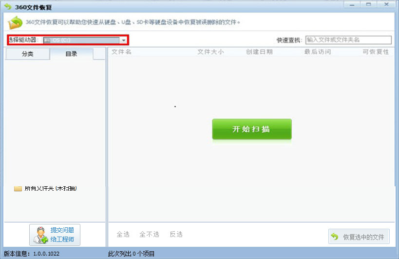 2. 使用 360 文件恢复工具,在选择驱动器中选择手机盘符,并点击开始扫描进行文件恢复。扫描结束后在目录中按照第一步的路径导出微信账户文件夹中的所有内容。