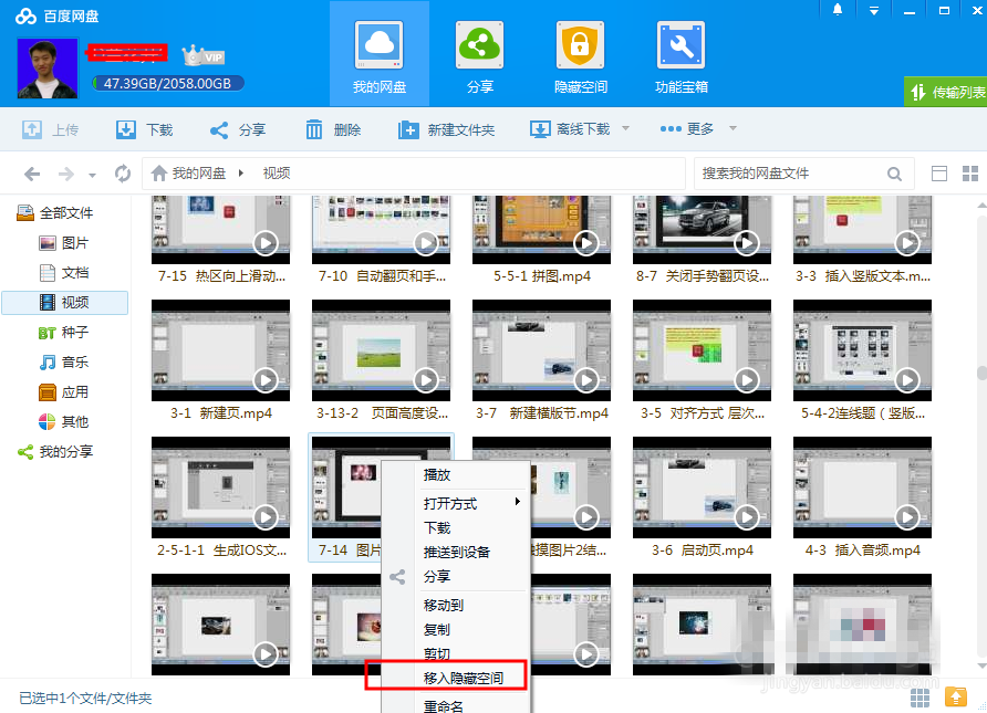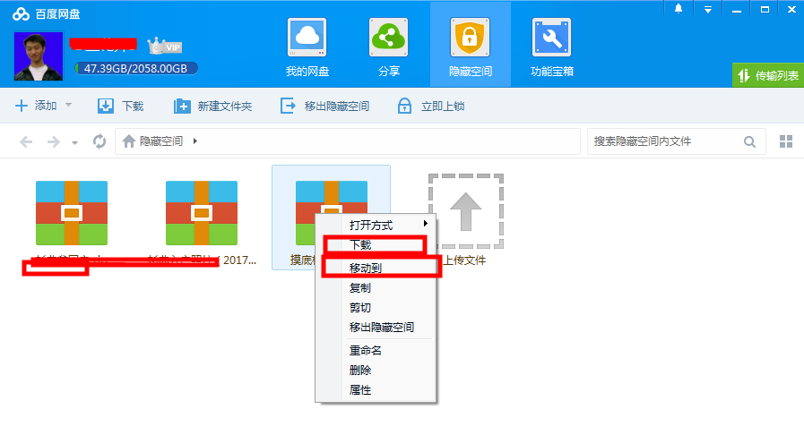 4. 隐藏空间开启后,返回开放网盘,将保密文件移动到隐藏空间保存。如图: