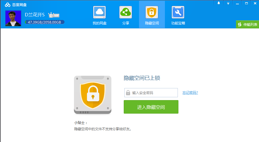 2. 点击网盘菜单中的“隐藏空间”即可启用,设置隐藏空间独立密码等安全设置。如图: