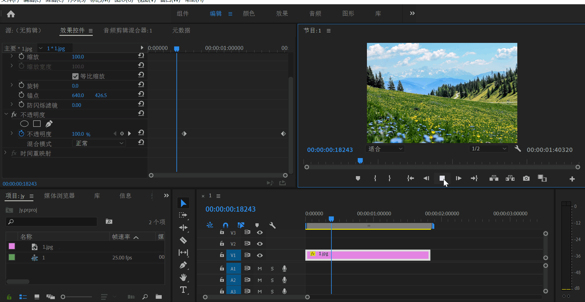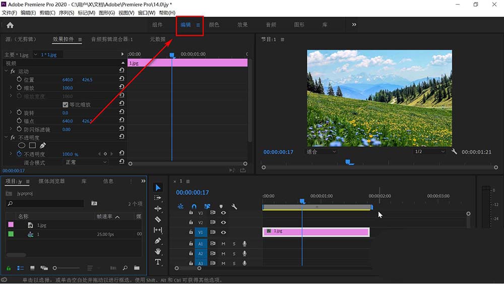 点击时间轴上的素材,然后将鼠标移动到上方工具栏,点击左上角的”效果控件”,