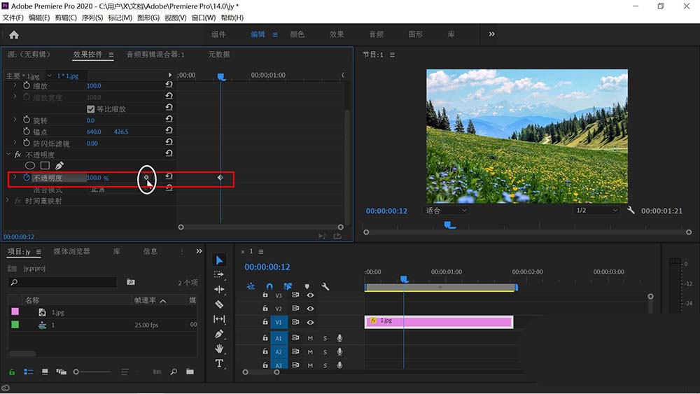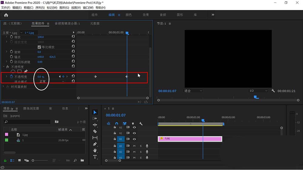 拖动关键帧窗口的时间滑块到合适位置,选择”不透明度”,点击右边的关键帧设置图标,出现第一个关键帧,