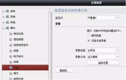2. 录像机未配置录像计划。排查办法:打开远程配置窗口,依次点击“事件“—“计划“查看是否配置有录像计划,测试录像机本地是否可以查看回放录像。