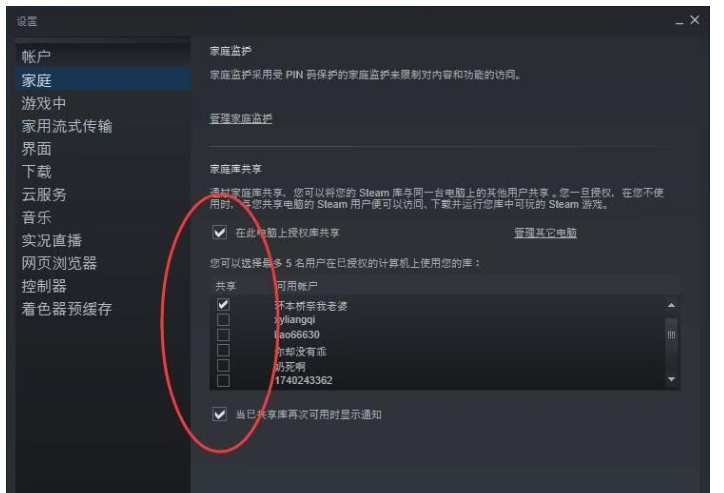 如果朋友正在使用你的共享库玩游戏,你登录了个人账号,就会把朋友踢下线。勾选“当已共享库再次可用时显示通知“,如果共享者没有使用游戏库,就会对被共享者进行提示。