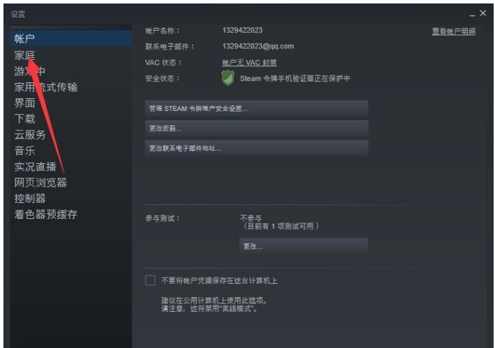 进入设置界面,如图,点击选择“家庭“选项,勾选“在此电脑上授权库共享“,即会显示出曾经在这台计算机中登录的所有 Steam 账户,
