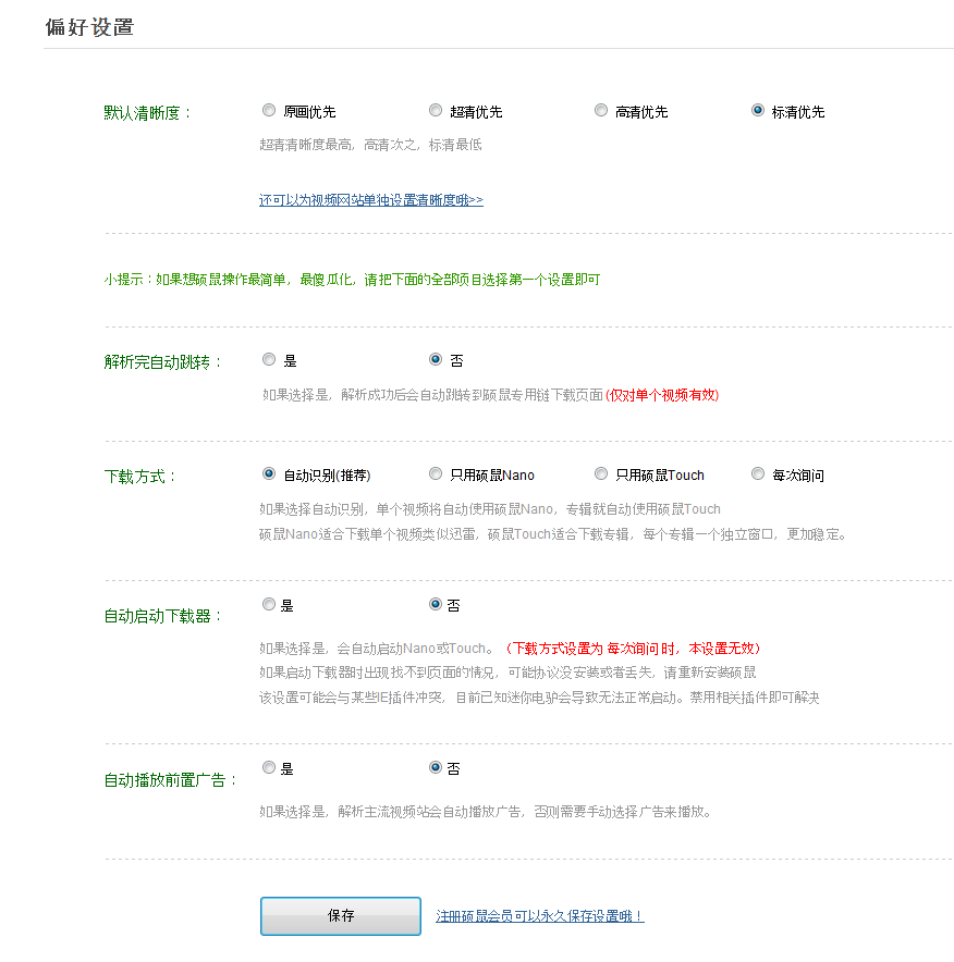5. 打开“偏好设置”界面后在这里就可以看到硕鼠的所有偏好设置了,比如说默认下载清晰度之类的。我们只需根据自身需求进行调整即可;