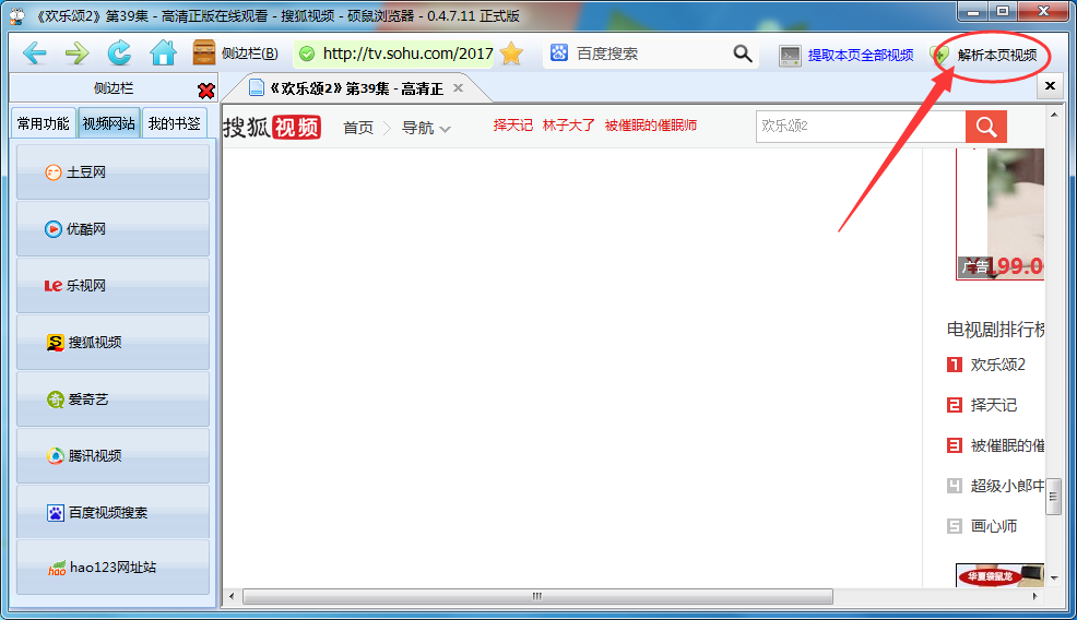 2. 打开视频播放界面后,我们再点击硕鼠界面右上角的“解析本页视频”;
