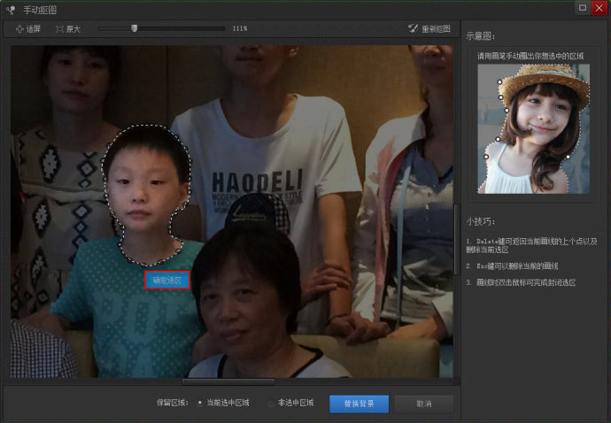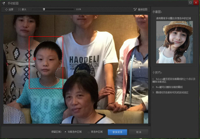 如果我们对图片上的某一部分不满意,可以将其提取出来,就是指“抠图“,抠图是将一张图片中的人物或物件抠出来,然后替换它的背景(或背景颜色)。我们平时在旅游. 拍摄集体照时,会发现照片中某个人拍摄时正好眨眼,照片上的眼睛是闭上的,很煞风景,我们可以借助光影魔术手来进行抠图操作,非常智能化。