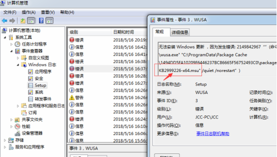 1. 打开计算机管理,查看电脑的日志文件:右击计算机选择“管理”-“系统工具”-“事件查看器”-“Windows日志”-“Setup”。可以看出是 KB2999226 这个补丁程序出现问题。(KB2999226 专门针对 WIN 7,其他系统的,可在微软官网搜索补丁号)