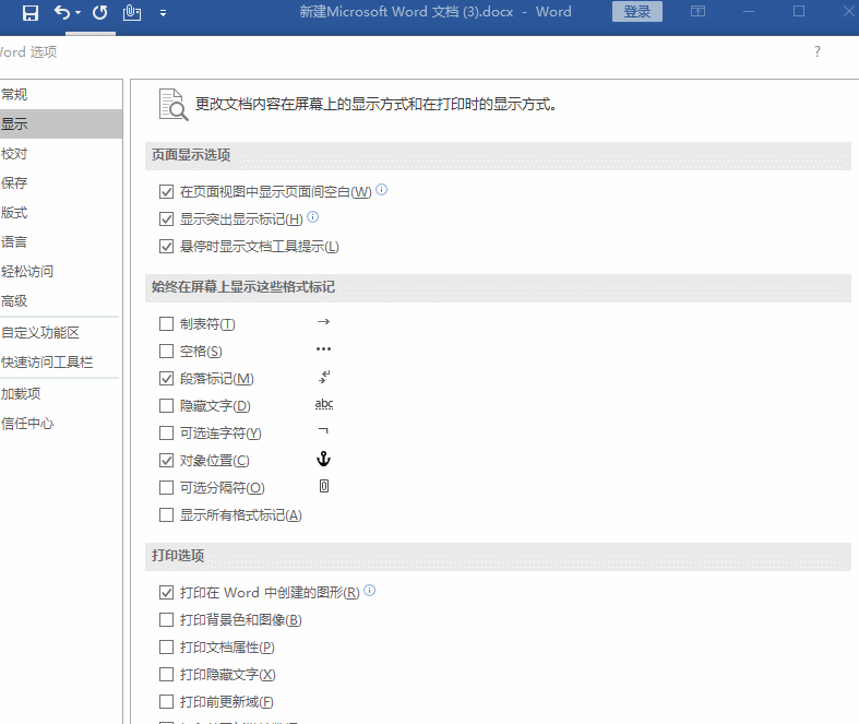 打开 Word 文档,点击菜单栏中的“文件“——“选项“——“ Word 选项“——“显示“,