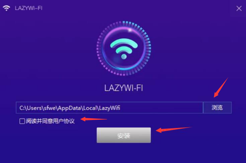 2. 然后,进入 lazy WiFi 的安装向导页。用户点击“浏览”选择它存放的路径,并勾选“阅读并同意用户协议”,点击“安装”按钮。