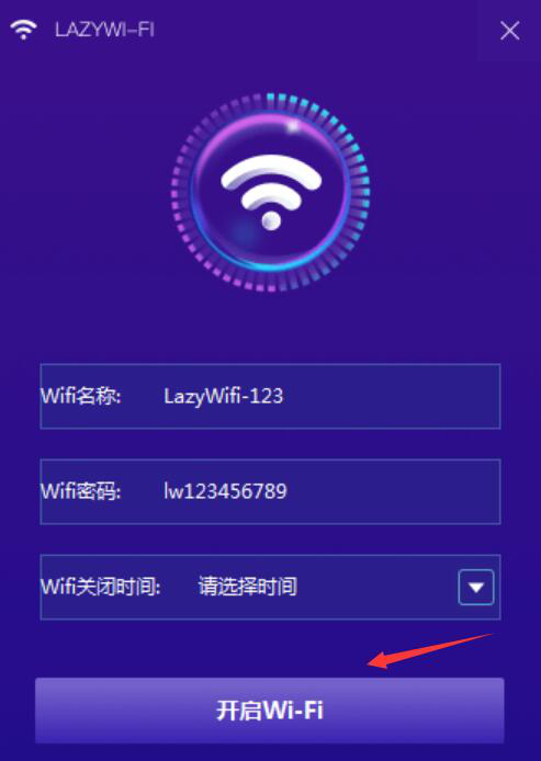 5. 最后,打开安装成功的 lazy WiFi。输入共享 WiFi 的名称、密码,设置 WiFi 关闭的时间,再点击“开启Wi-Fi”按钮,lazy WiFi 便开始执行共享 WiFi 的指令。手机搜到该 WiFi,输入密码便可以上网了。