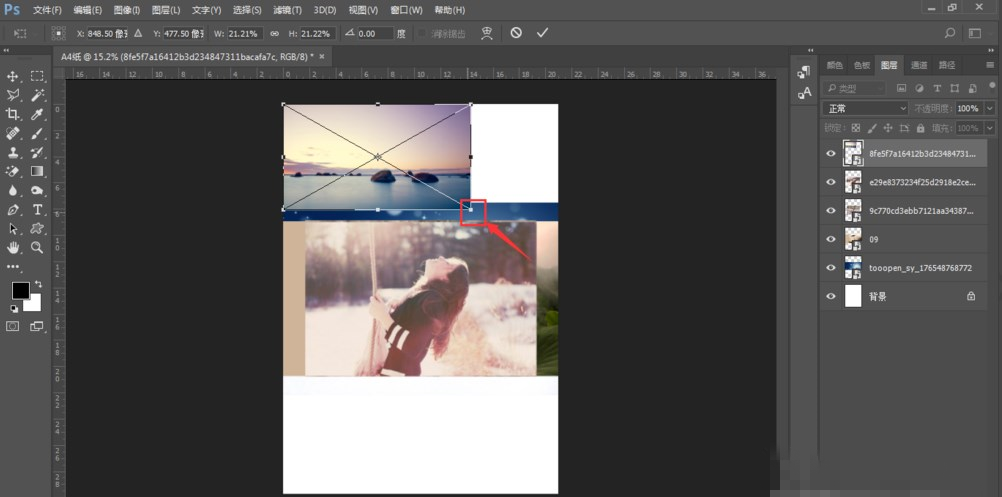 3. 用鼠标点击其中一个图层,就会选中其对应的左侧画布中的图片。然后按 Ctrl + T 变换,在左侧的图片会出现一个选择框,鼠标移动到图片上点击不松手,可以自由移动图片的位置。鼠标移动到边框的斜角位置,当出现斜杠图标,这时可以变换图片大小,按住 Shift 键,可以固定比例改变图片大小。