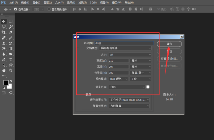 1. 打开 PhotoShop 软件,新建一个画布,小编这里建立了一个 A4 纸张大小的画布,