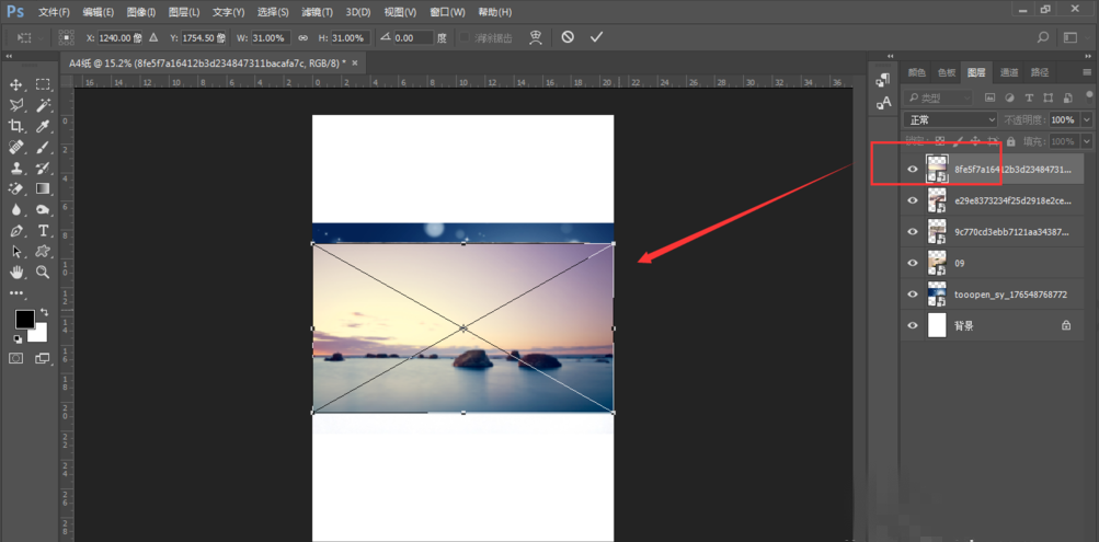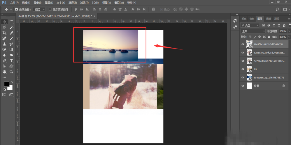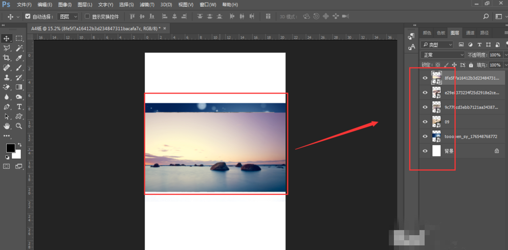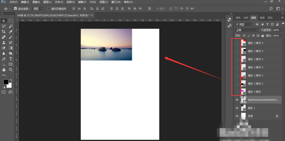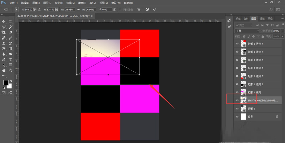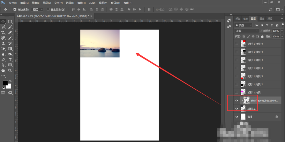 选择一张图片拖入画布中,这时新拖入的图片图层是在整个矩形图层的上方。