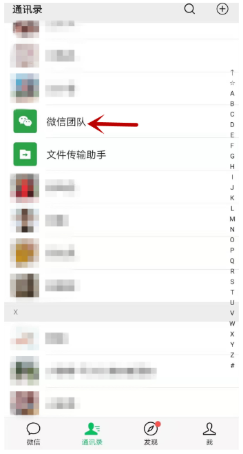 打开手机微信,进入界面,点击”通讯录”,在其中找到”微信团队”,