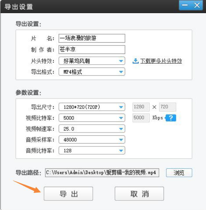 5. 接下来,用户在爱剪辑弹出来的“导出设置”窗口中,根据自己的需要进行相关的设置,点击“导出”按钮。爱剪辑便开始执行把多个视频合并成一个视频的指令。