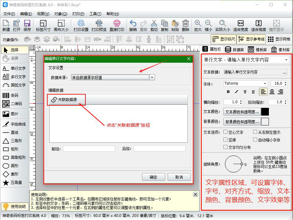 3. 此外,如果用户选择的数据来源是“来自数据源字段值”,就点击“关联数据源”按钮,将需要进行文字编辑的文件导入神奇条码标签打印软件。