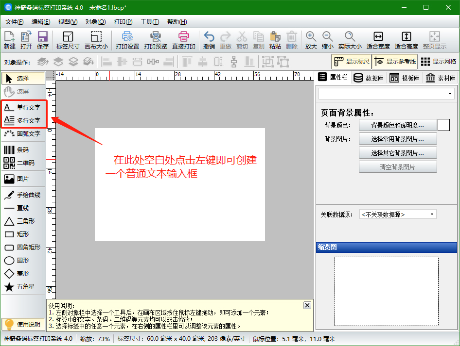 1. 首先,用户在神奇条码标签打印软件的编辑区域单击鼠标左键,它便会出现如下图的一个文字编辑的文本框。用户根据自己的需要点击左侧工具的“单行文字”、“多行文字”或“圆弧文字”,这里选择的是“单行文字”。