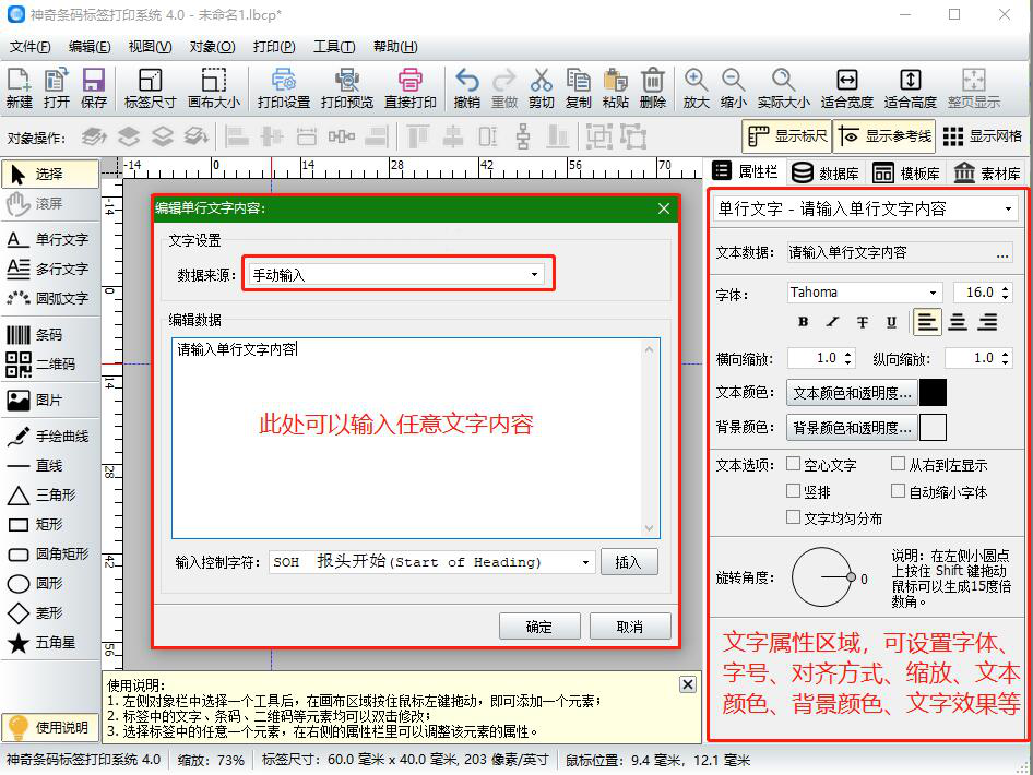 神奇条码标签打印软件在进行文字编辑的过程中,一般来说,应用最多的是单行文字的编辑样式,其次是多行文字和圆弧文字。为了标签更有个性化,在编辑文字的时候可以根据自己的需要应用相关的格式。