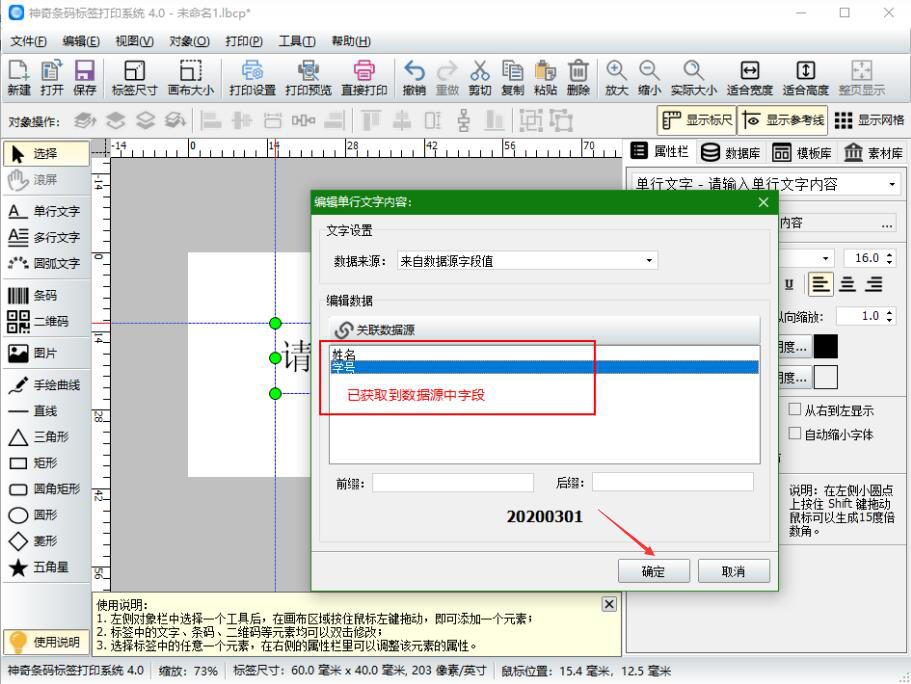 4. 导入成功,点击自己需要进行文字编辑的条形码标签文本,再点击“确定”按钮。
