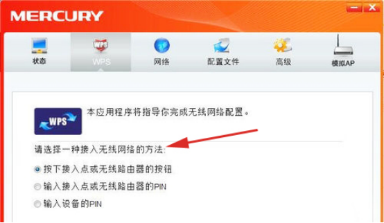 3. 等待 mercury 无线网卡驱动自动安装完毕后,在其界面上点击“WPS”,然后勾选“按下接入点或无线路由器的按钮”。
